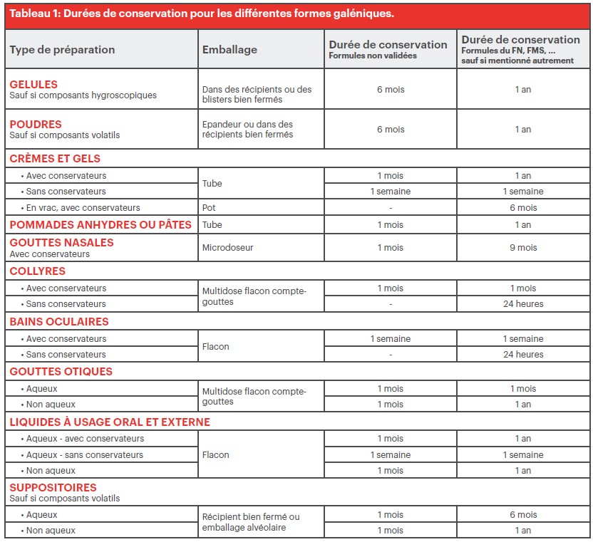 La durée de conservation et d'utilisation selon le Formulaire Thérapeutique Magistral1